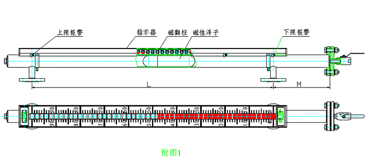 結構原理 液位計根據浮子原理和磁性耦合作用研制而成。當被測容器中的液位升降時,液位計主導管中的浮子也隨之升降,浮子內的永久磁鋼通過磁耦合傳遞到現場指示器,驅動紅、白翻柱翻轉 180 °,當液位上升時,翻柱由白色轉為紅色,當液位下降時,翻柱由紅色轉為白色,指示器的紅、白界位處為容器內介質液位的實際調高度,從而實現液位的指示。